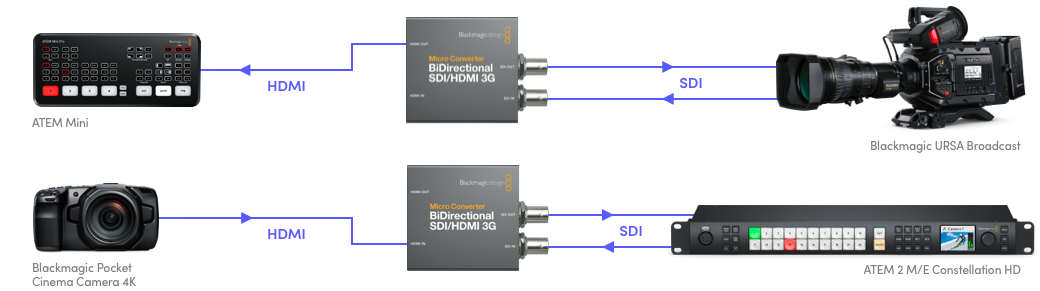 Basta conectar a saída SDI do conversor à entrada do switcher, a saída de programa do switcher à entrada do conversor e, em seguida, a entrada HDMI do conversor à Pocket Cinema Camera. Depois, é só adicionar um número de câmera no utilitário do conversor e você obterá controle do corretor de cores da câmera, sinalização e até gravações remotas. Ele também funciona na ordem inversa, assim você pode conectar e controlar uma câmera SDI partir de um switcher HDMI, como o ATEM Mini.