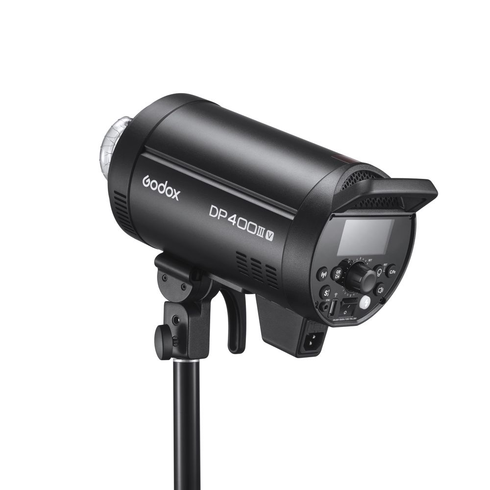 O flash de estúdio Godox DP400IIIV é um monolight de 400 W com diversas funções profissionais. A cabeça tem uma temperatura de cor de 5600K, um tempo de reciclagem para potência máxima de 1 segundo e uma duração de flash ajustável de 1/800s a 1/2000s.
