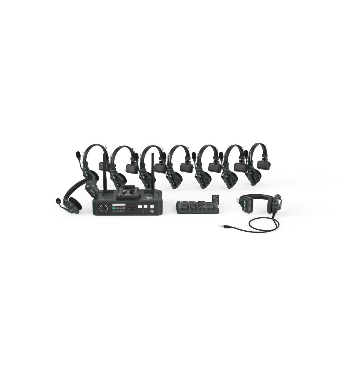 Cada fone de ouvido de intercomunicação vem com uma bateria de lítio sobressalente para substituição durante a produção, mantendo o sistema funcionando sem interrupções. As baterias são externas e recarregáveis com um carregador multiportas. As baterias requerem apenas 2,5 horas para atingir a carga total e cada uma fornece até 10 horas de autonomia para cada telefone (5-6 horas para o telefone base).