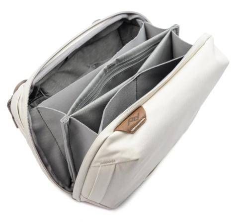 A Bolsa Peak Design Travel Tech 2L, em osso branco, faz parte de um sistema de compartimentos que melhora sua capacidade de organizar o conteúdo de uma bolsa da série Travel da Peak Design.